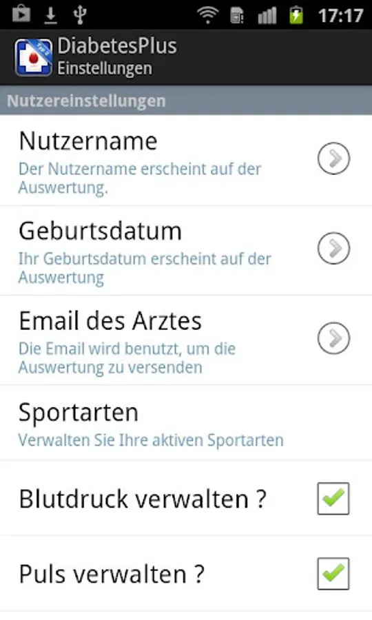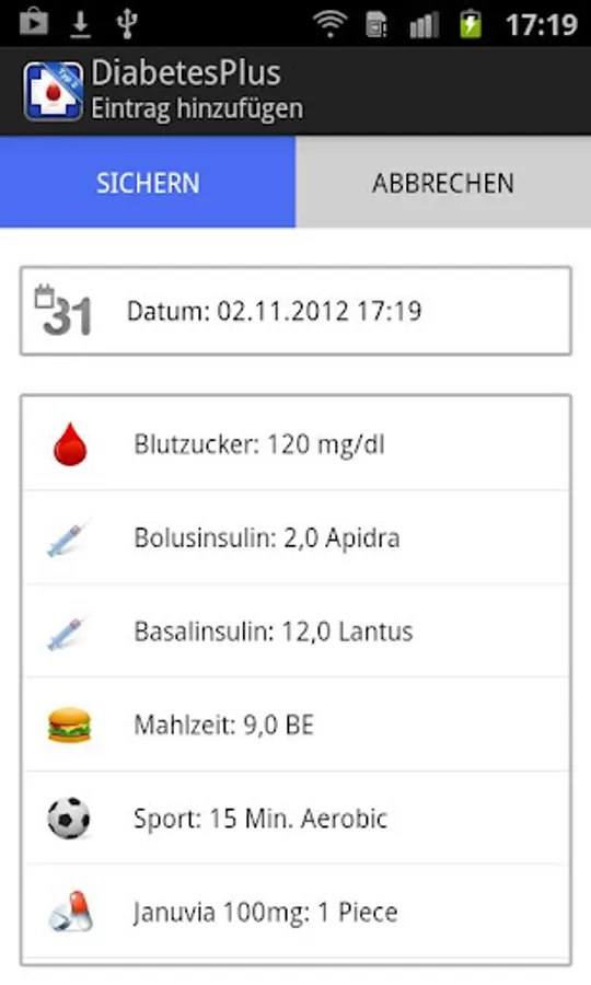 Administer your blood glucose (mg/dl and mmol/l), carbohydrates, sport activities, blood pressure, pulse, weight, notes and all your medication simply and effectively with DiabetesPlus for type2 diabetics on your Android-Smartphone.