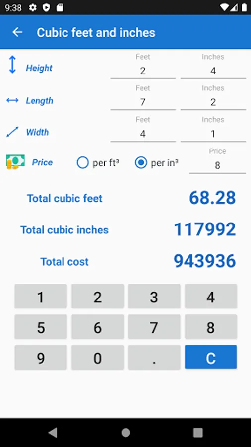 You just have to set the width, height in feet and inches, and the area will be displayed instantly. Height should also be set to calculate the volume.