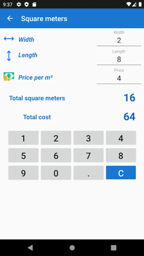 Application to calculate an area of a room. It should have a square or rectangular shape. You can also calculate an area of a space (cuboid or cubic shape).
