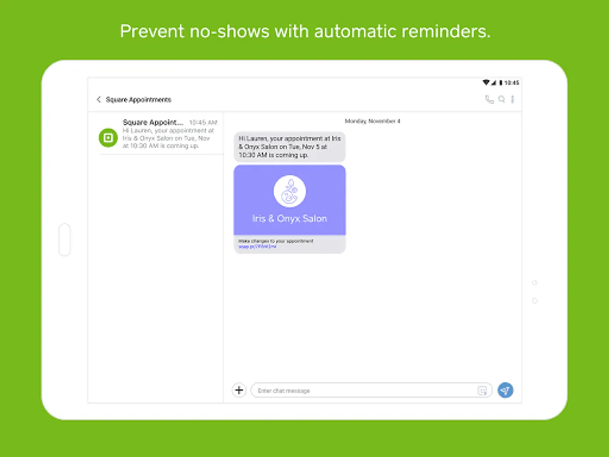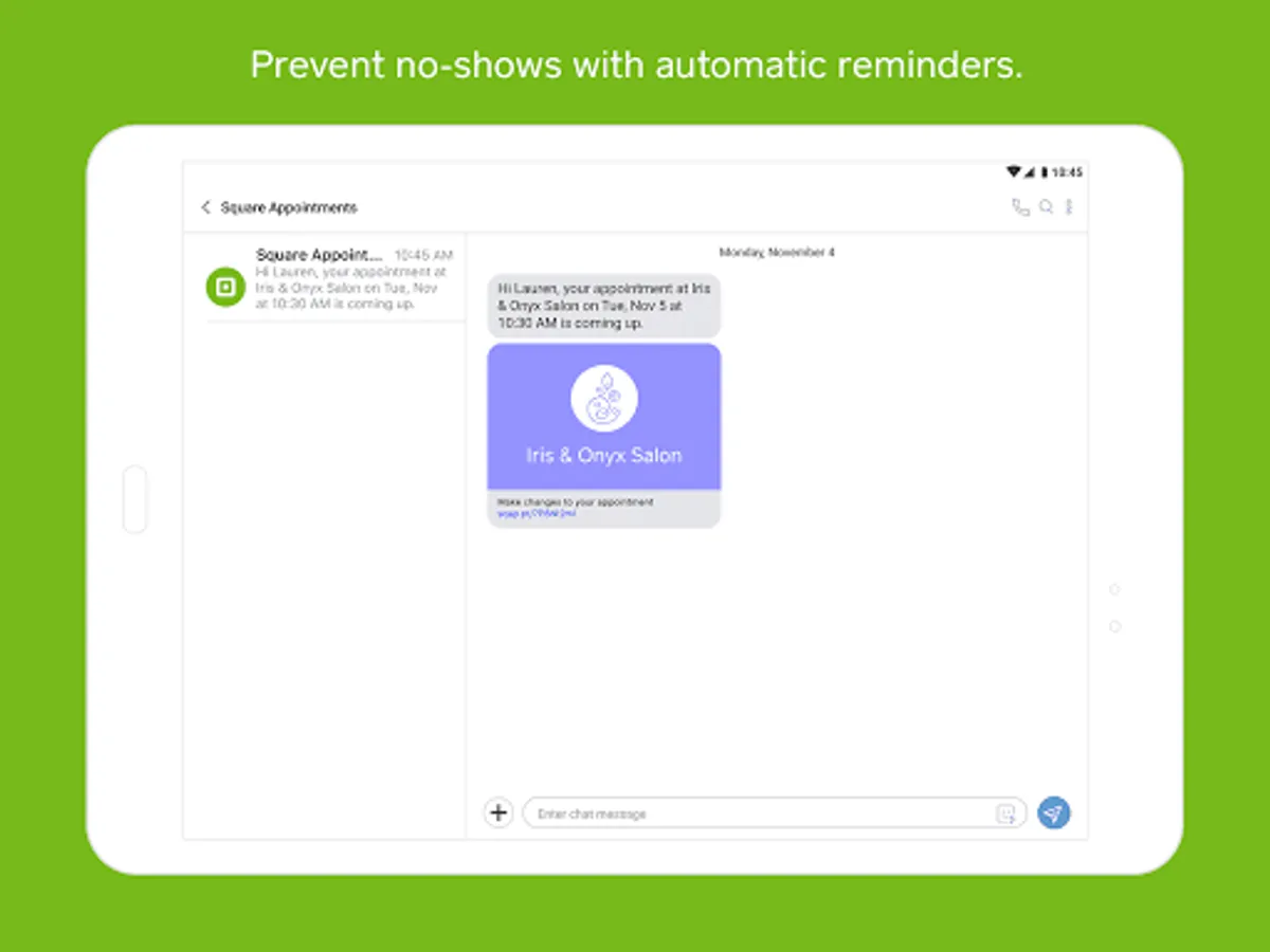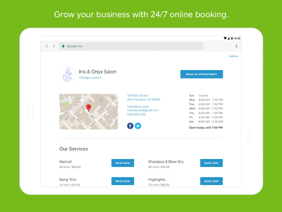 Square Appointments has everything you need to run your business from anywhere: online booking that’s easy for you and your customers, a point of sale that tracks customer details, and a secure, fast payments system—all in one place. It’s free for individuals. And really affordable for teams. Get 24/7 online booking, automatic appointment reminders, seamless payment processing, and no-show protection with Square Appointments for Android.