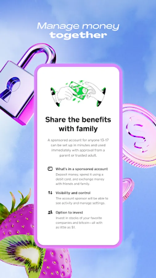 Everyone 13 and up can send money to friends, get a Cash Card, invest, or start a savings goal with approval from a parent or trusted adult for a sponsored account.