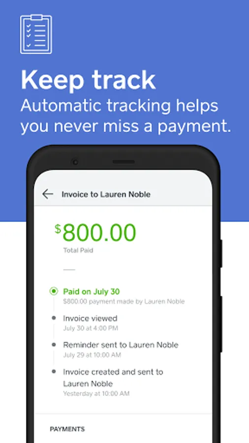 ► Stop chasing down payments with automatic payment reminders and transparent invoice tracking that tells you the moment each invoice is viewed and paid.