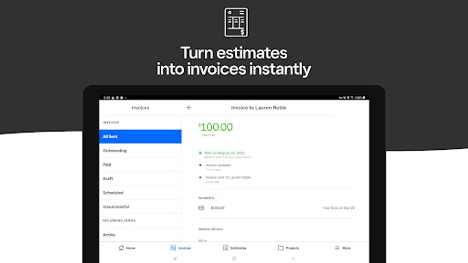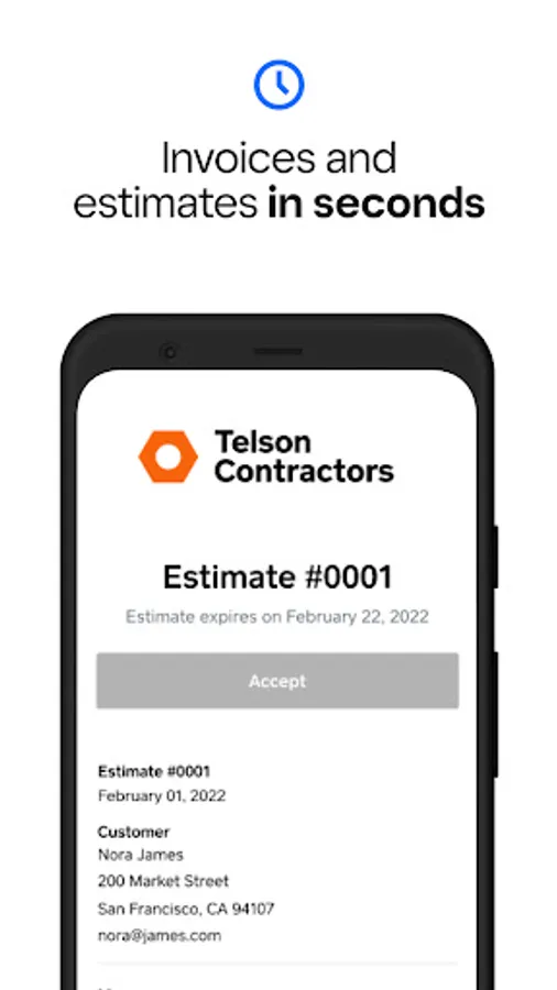 Book your next job by sending an estimate that your clients can approve with one click. Easily convert an approved estimate into an invoice from the app. Creating and sending professional invoices and estimates is a breeze with simple-to-use invoice templates. Simply enter the customer's email, the payment amount, and click "Send invoice" to finish.