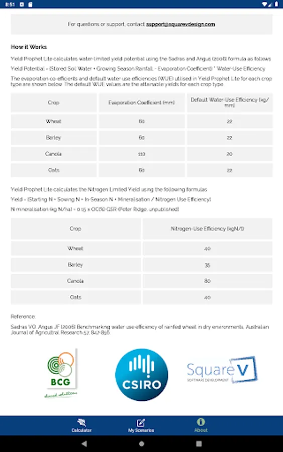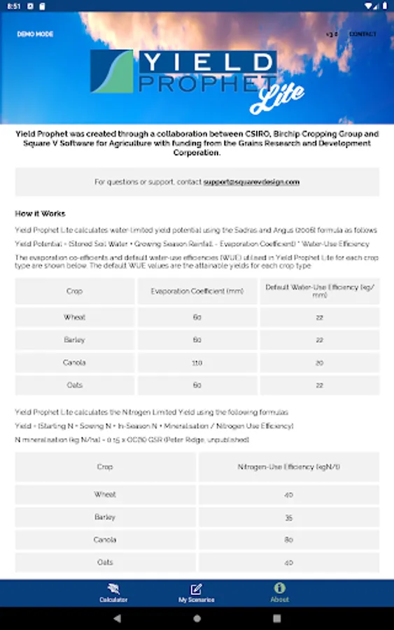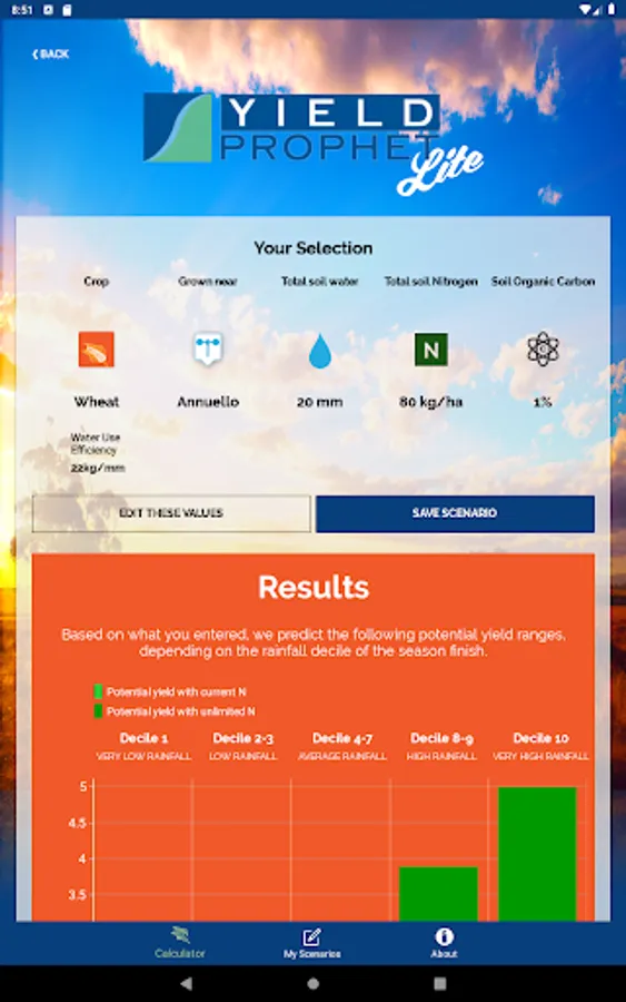 Yield Prophet Lite calculates water-limited yield potential using the Sadras and Angus (2006) formula. It also uses the POAMA/ACCESS model to give the rainfall likelihood for the remainder of the growing season.