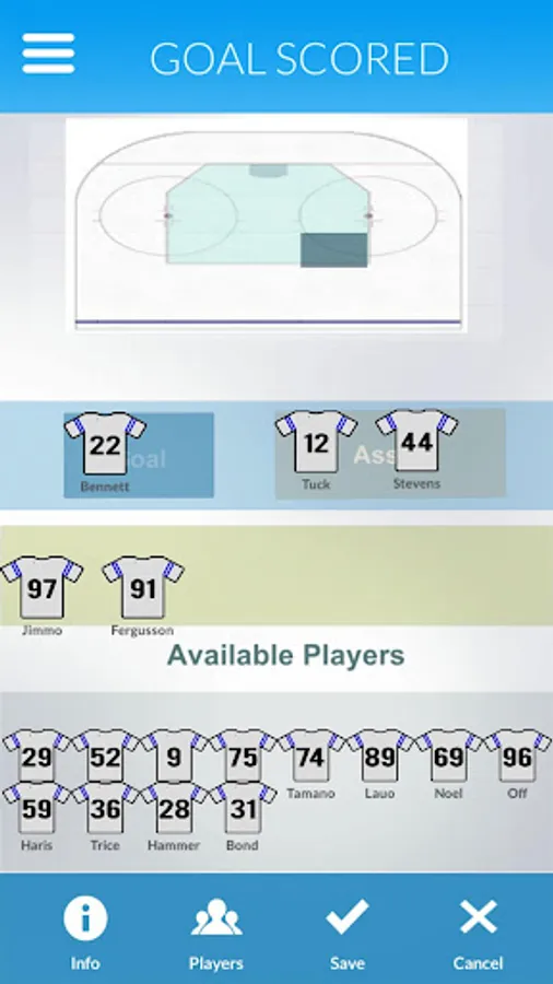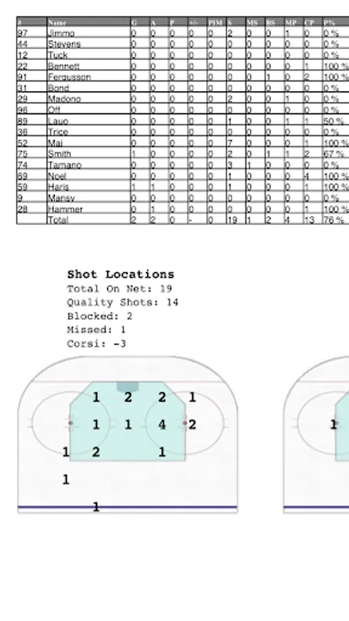 Shot location data can be recorded and provide useful information on the quality of the shots your team is taking and also allowing. You can record blocked and missed shots and generate your team and individual players Corsi.