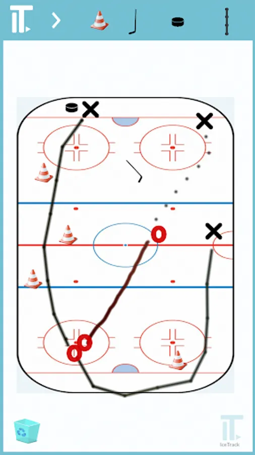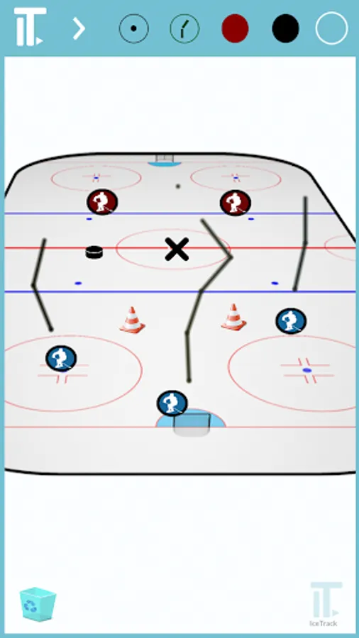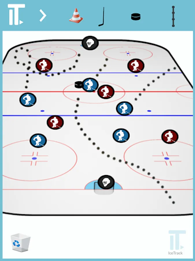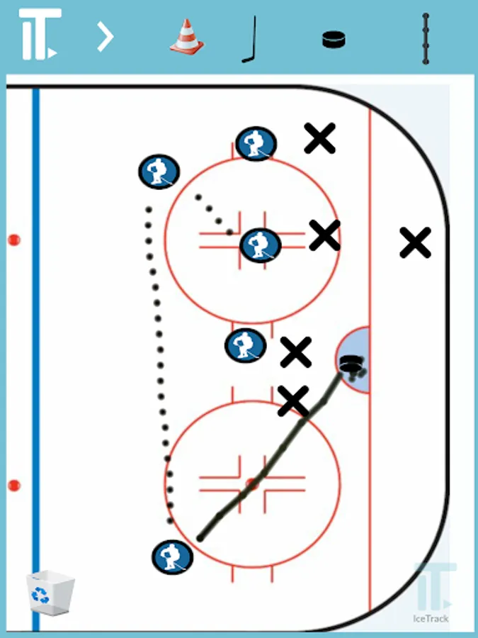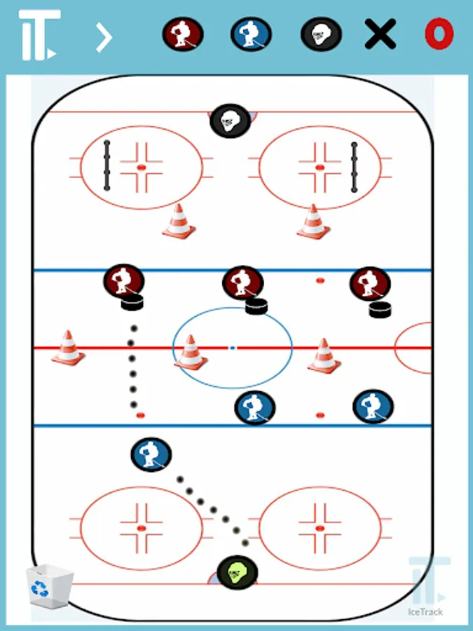 Drag and drop items across the board to show position or how a drill will be laid out. You can drag and drop players, practice objects, draw lines & dots on 3 different rink diagrams.