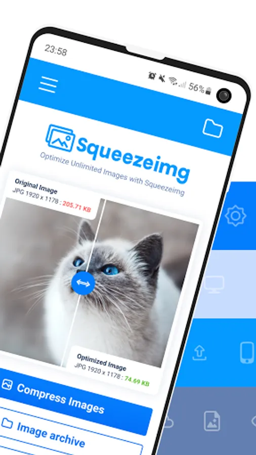 Squeezeimg helps you to easily optimize your images using fast image compression and conversion without any visible loss of quality.