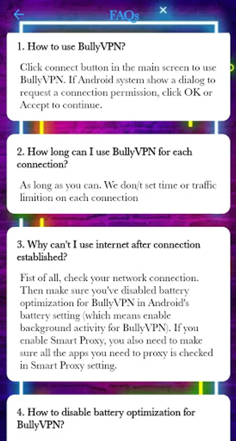 "Android's" battery setting (which means enable background activity for BullyVPN).