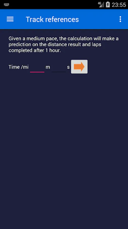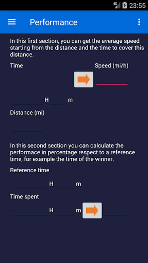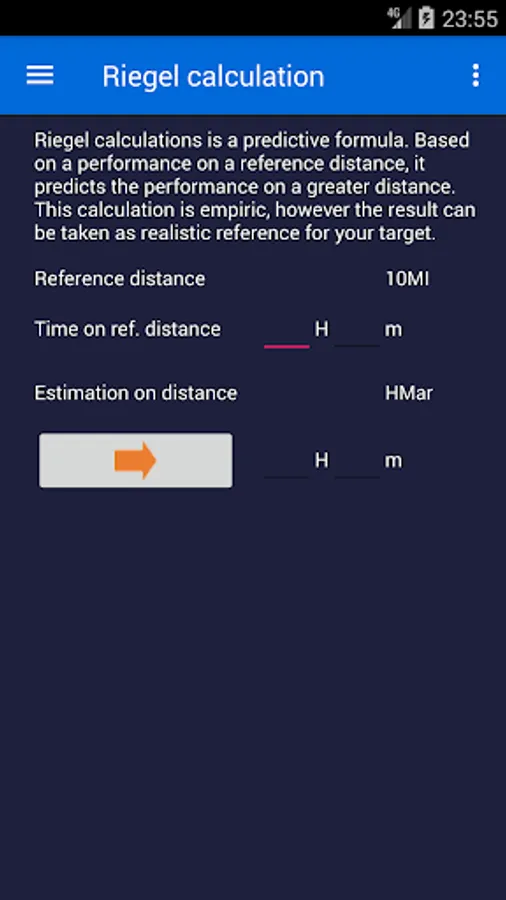 This app collects many of main mathematical formulas, from the simple and used ones. In fact, it offers a fast tool to convert pace to speed and viceversa. It offers also a simpe Riegel calculation, which is an empirical formula, which estimates the performace on a distance given a performance on a smaller distance. It includes a tool to estimate the athletic track laps based on the average pace. The last page contains two sections: the former is to calculate the average speed and average pace given the distance and the time of a performace, the latter calculates a performace in percentage to another time (for example, respect to the winner). All formulas support both International System Units (km) and Imperial System Units (miles).