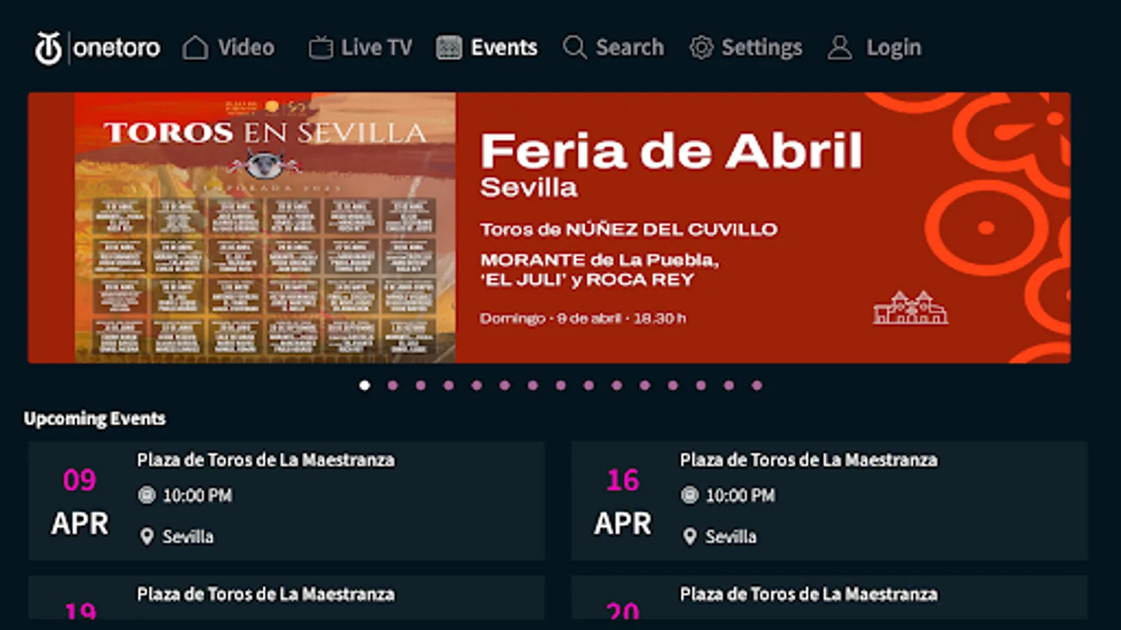Onetoro TV is the application to access the premium Onetoro TV channel, edited in Spain with the best Bullfighting Festivals from the international circuit: Seville, Madrid, Valencia, Nimes, Arles, Béziers, Mexico, Colombia, Ecuador or Peru. Each year, broadcasts in more than 50 arenas around the world. The programming is complemented by current programs and specials on the world of bullfighters and ranches made by expert bullfighting professionals and first-class journalists. The content is presented through a live TV Channel where the bullfights are broadcast, and it is complemented by access to a catalog of Onetoro TV Videos (video on demand) with different sections: Festivals, Bullfighters and Ranches, current programs and specials covering the widest range of programming about Onetoro TV