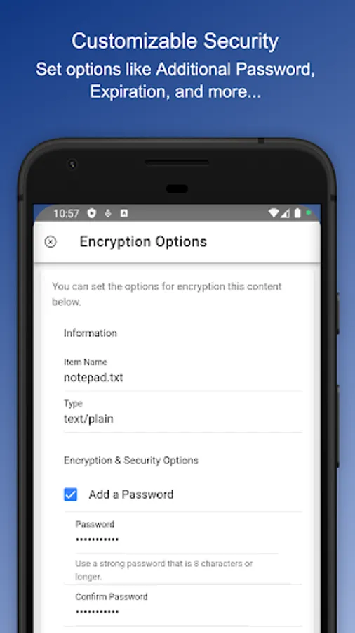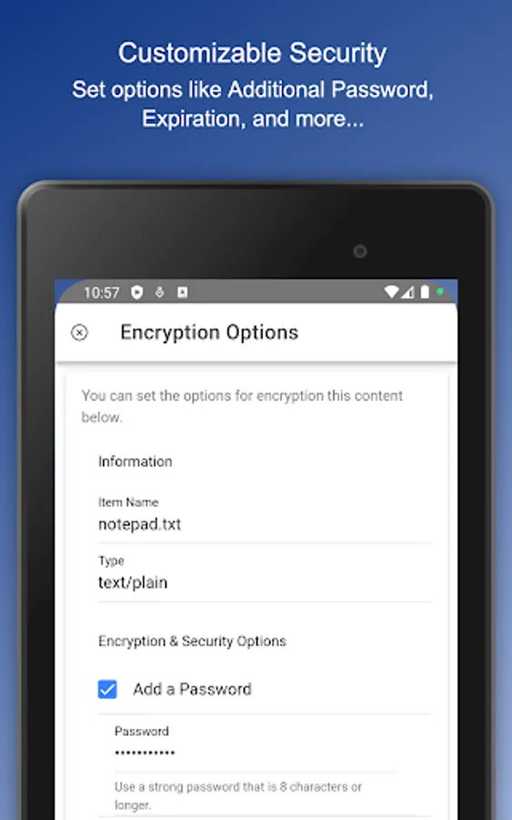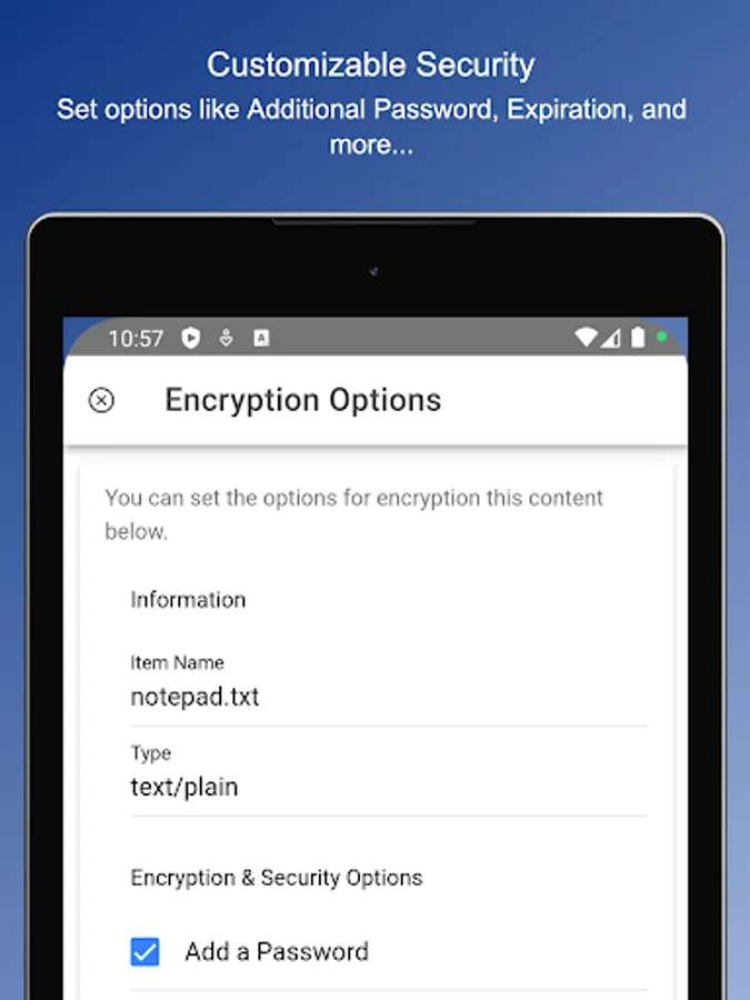 Additionally you can add more security by locking access to the file with a private password. You can also have the file expire and be securely destroyed from our servers after a period of time or after it has been read.