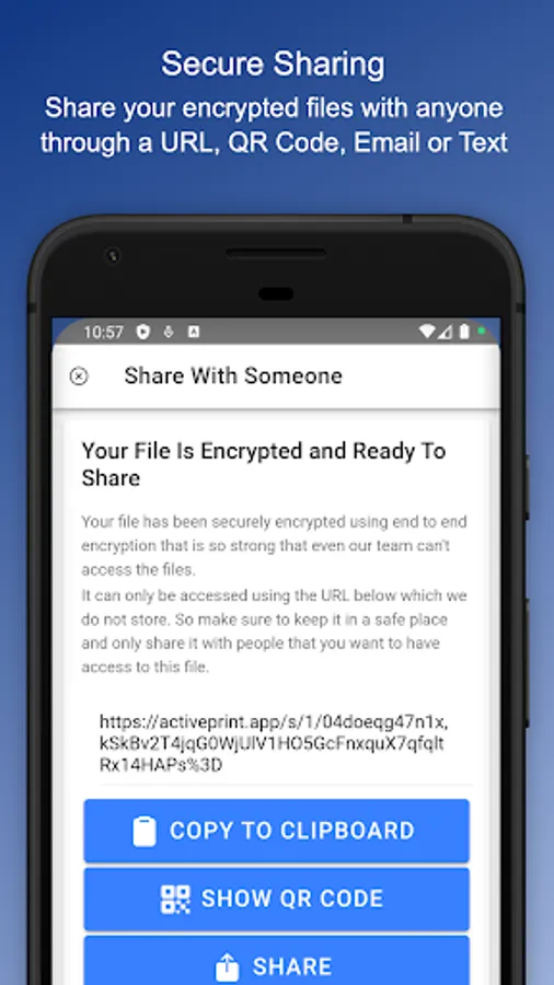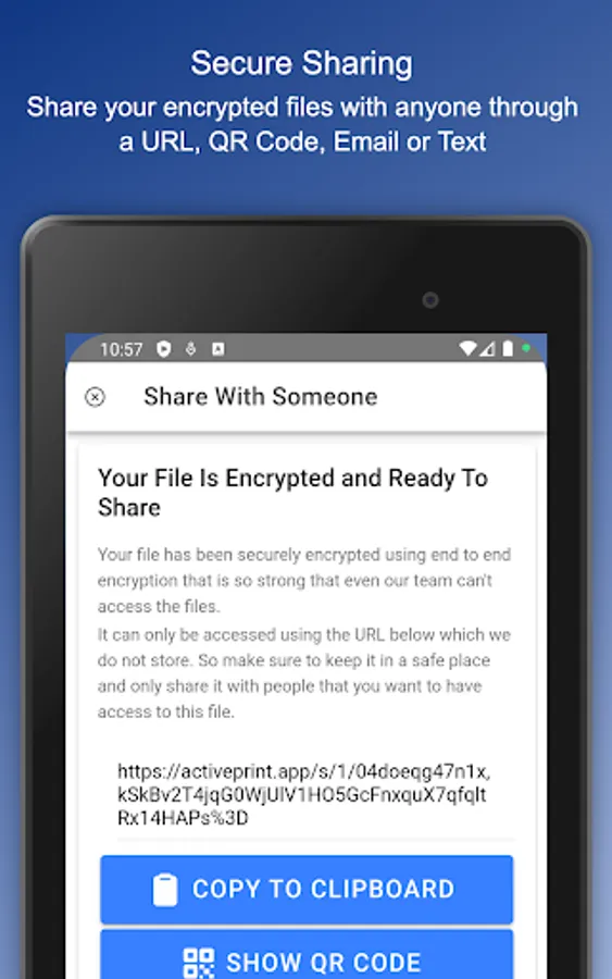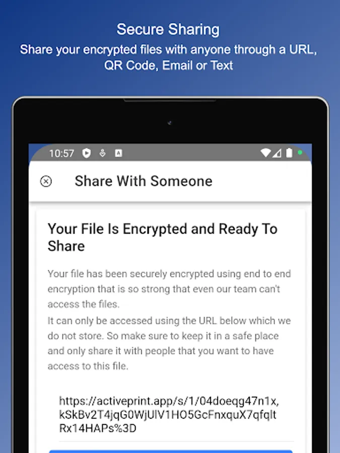 Each file is encrypted with end to end encryption and best in industry AES 256bit cryptography using a strong private key that is generated for you on the fly. The software incorporates this key into a private and unique URL that you can share with anyone from your mobile device using a QR code, copy and paste, or through a private email or text message through the app of your choice.