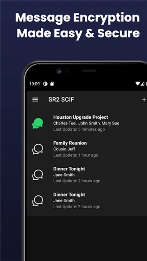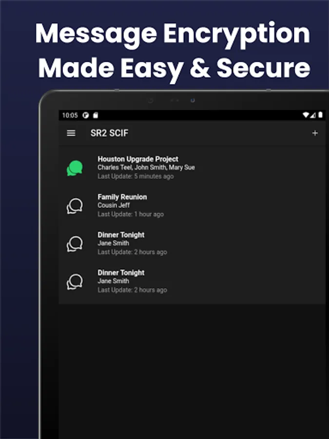 - Encrypted Messaging: every message that you send and receive is encrypted and decrypted on your device so that no one between you and the person you're talking to can ever read your conversation. We use a mix of Elliptic Curve Cryptography, and AES 256 Bit Cryptography. Simply the best most tested encryption available. Encryption that is implemented in such a way that not even the team at SR2 Solutions can read your messages.