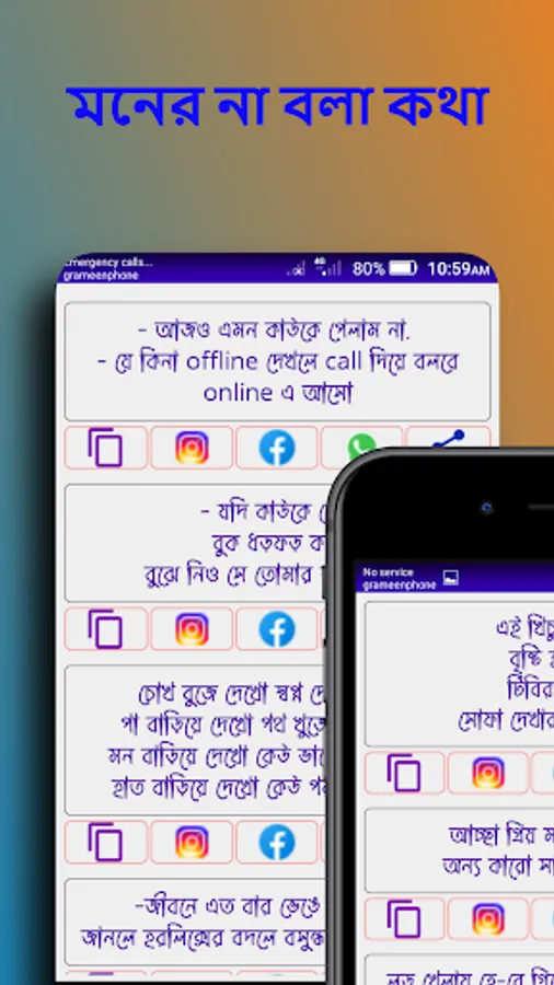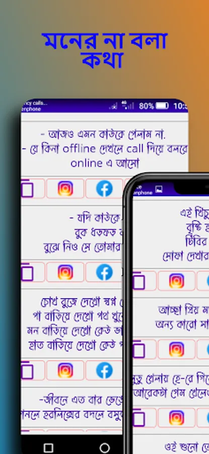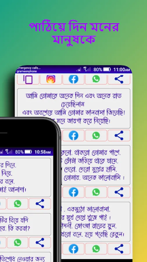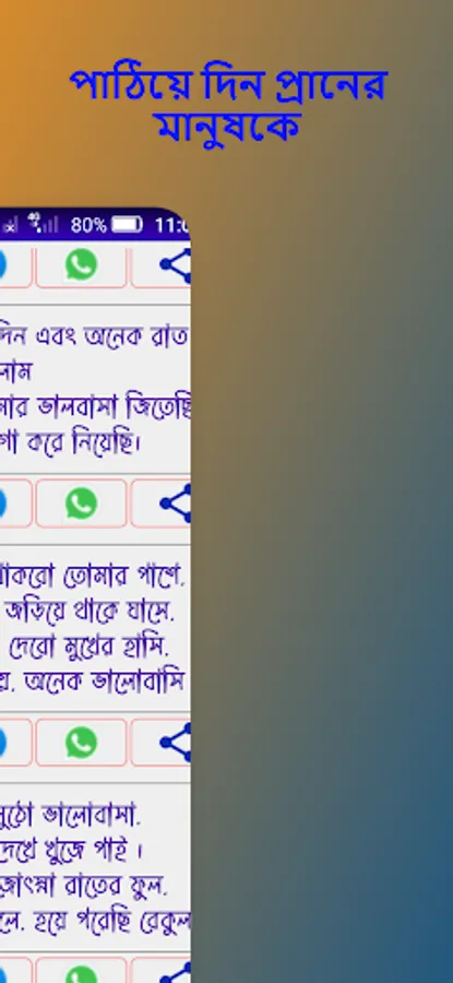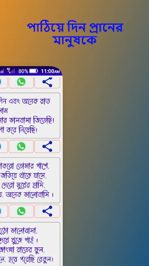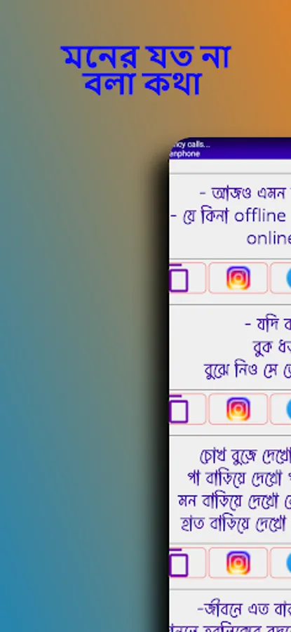 আর তাদের জন্যই আমরা নিয়ে এলাম সম্পূর্ণ বাংলা ভাষায় ভালবাসাময় এসএমএস। এ অ্যাপ থেকে খুব সহজেই যেকোনো কবিতা বা ছন্দ কপি অথবা শেয়ার করে পাঠিয়ে দিতে পারবেন আপানার মনের মানুষকে ভালোবাসার সব অনুভুতি।