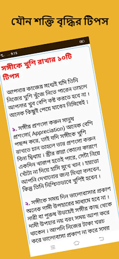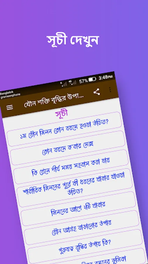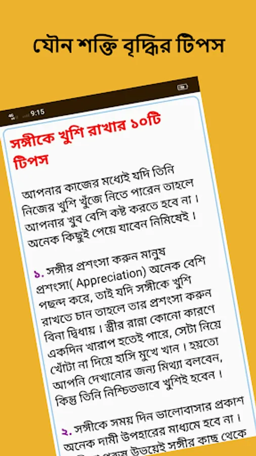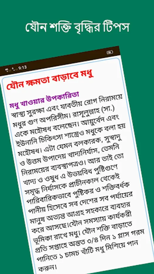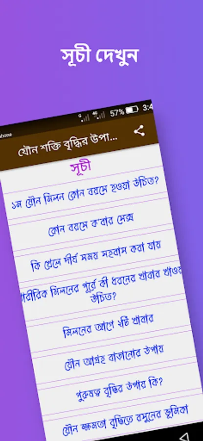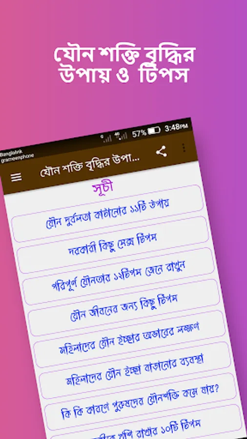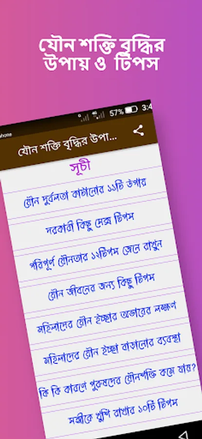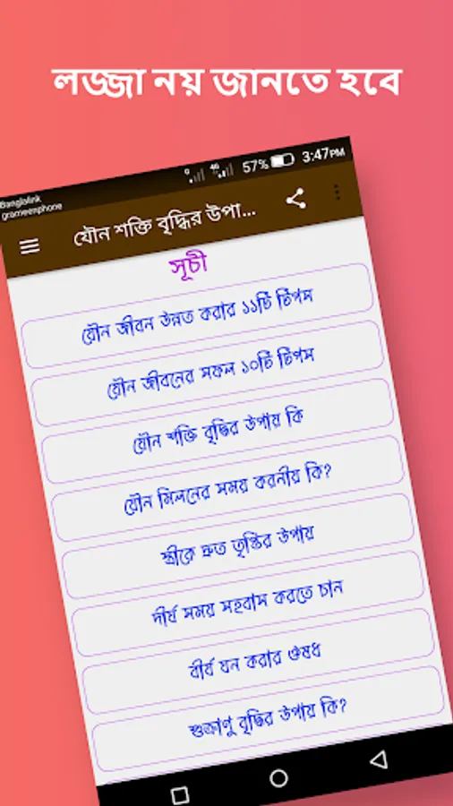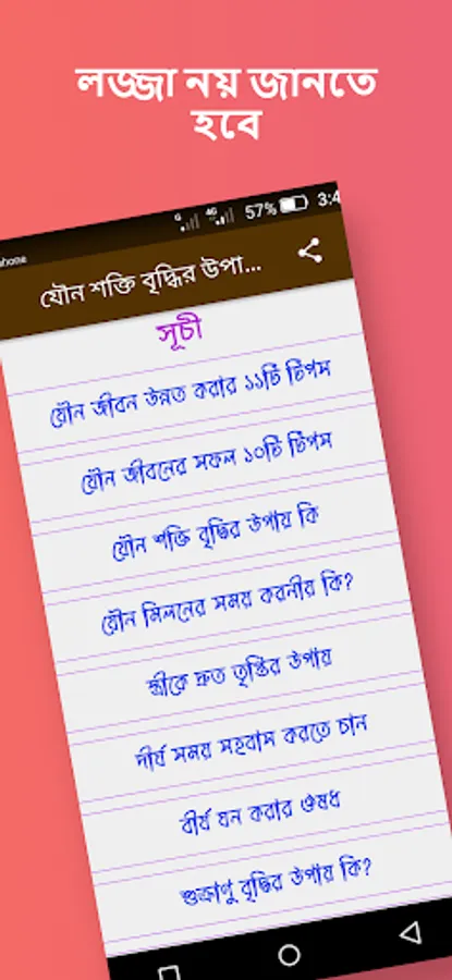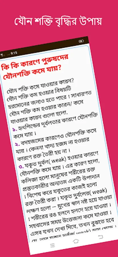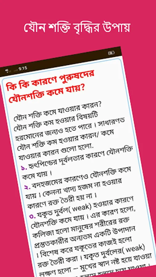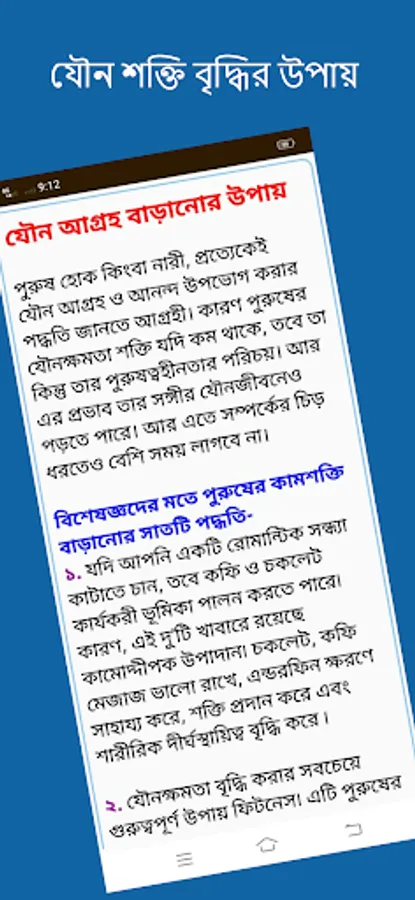 তাই এমন একটা গুরুত্বপূর্ণ সমস্যার সমাধানের জন্য আমরা নিয়ে এলাম যৌন শক্তি বৃদ্ধির উপায় ও টিপস নামক অ্যাপ। যার মধ্যে ছেলেদের গোপন সমস্যা সম্পর্কে বিস্তর আলোচনা করা হয়েছে। আশা করি যৌন শক্তি বৃদ্ধির উপায় নামক অ্যাপের মাধ্যমে অনেক কিছু জানতে বা শিখতে পারবেন।