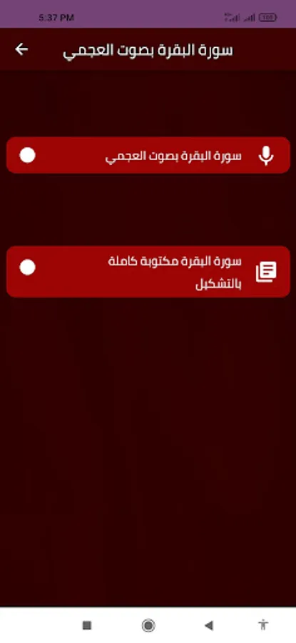 يمكنك التنقل بين أزرار تطبيق سورة البقرة بصوت العجمي بسهولة