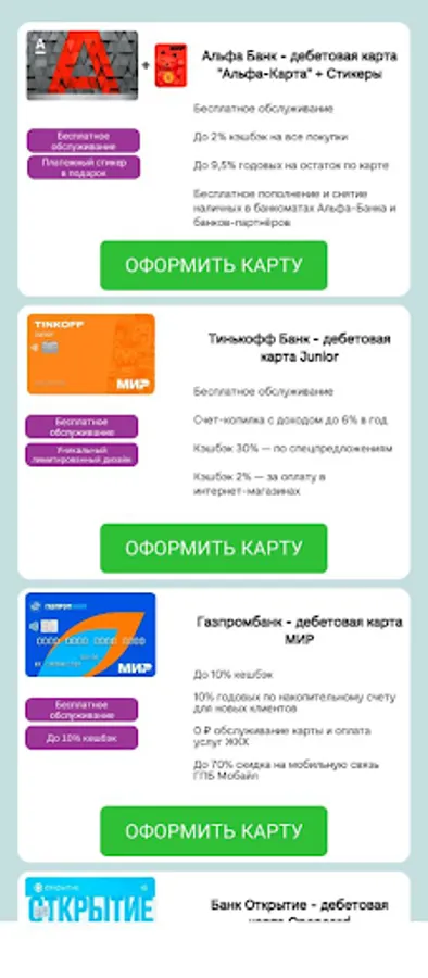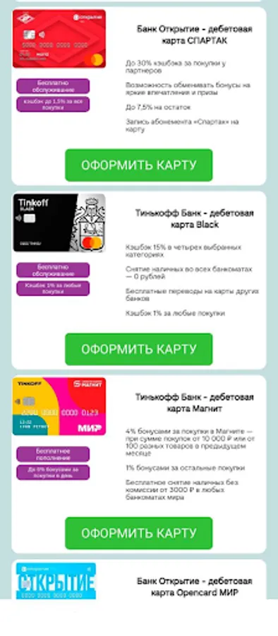 What is a debit bank card? In fact, this is the use of a bank card that can be used to pay for goods and services, receive cash at the box office, ATMs and perform transactions after its activation. Such products are often considered settlement or payment products. They can be both unnamed and personalized, with interest on the amount or with a credit limit (overdraft), as well as with an individual design. There is a slight lack of a holder on plastic and, as a rule, is issued at the time of application. You can create your own design on the website of a credit institution offering such a service. Where to choose options, how to choose the right ones and which ones to finally choose? The selection of the product is carried out on the basis of the purposes of its use, the type of tariff and other parameters that are important for consumers. Service Debit cards RU by selection from the proposed banks Access, how much the issue costs, what options are available and technological features. Comparison of debits from different banks will help you choose the best one for yourself. How to apply? You can get a new card with interest accrued on exceptional funds at the bank office or order via the Internet. Making online applications allows you to reduce the time that the client spends filling out questionnaires at the branches of a credit institution, and immediately apply to several financial institutions, because many of them have the ability to open online. Ready must be picked up at the selected branch. Can she be like this? When choosing the cost of service for many people plays a minor role. Mandatory are the costs of issuance, annual or monthly maintenance, the amount of the security deposit provided to the account at the request of the issuer, and the size of the conditional contribution. Free options can be found in a special section in our application.