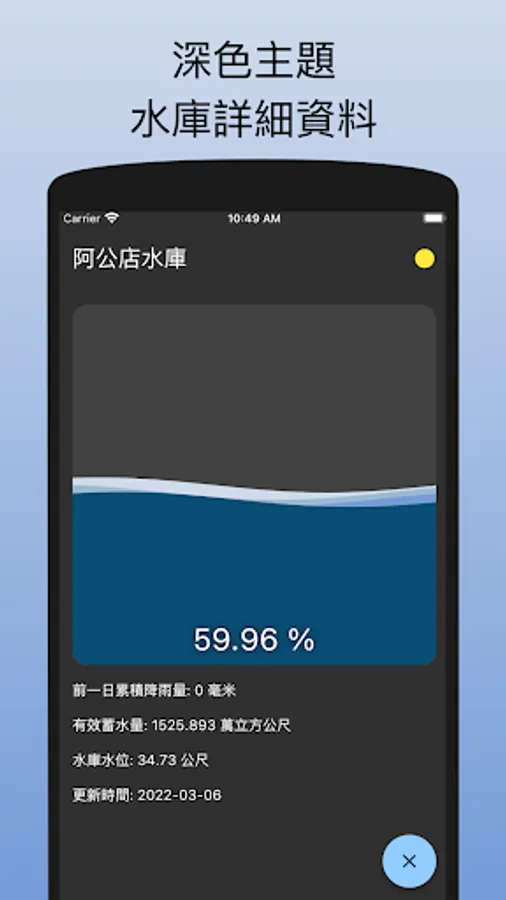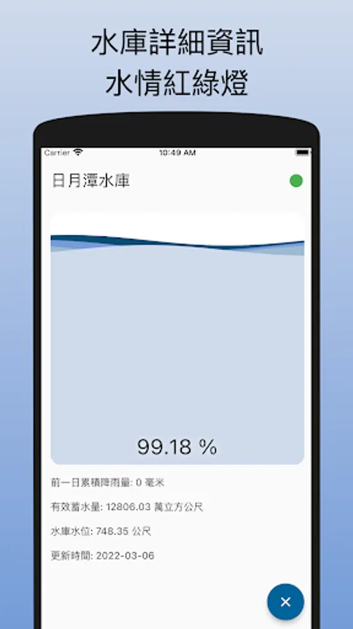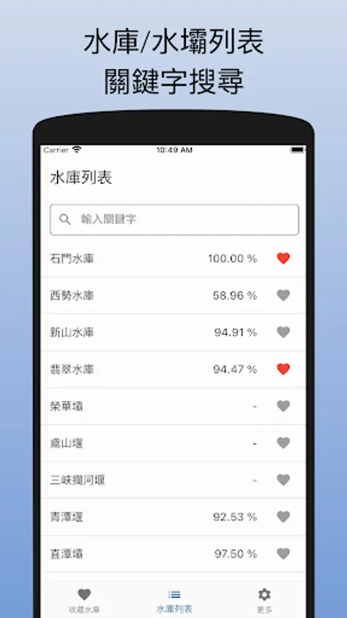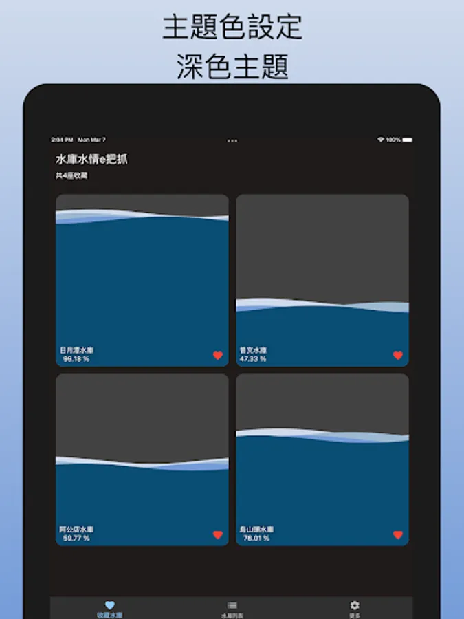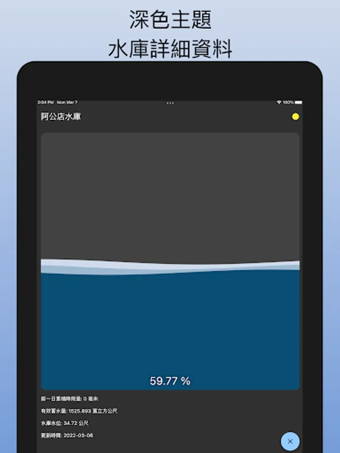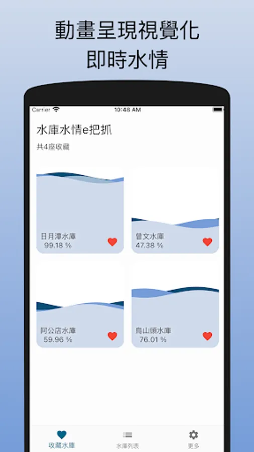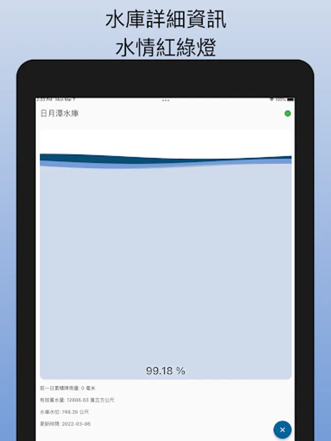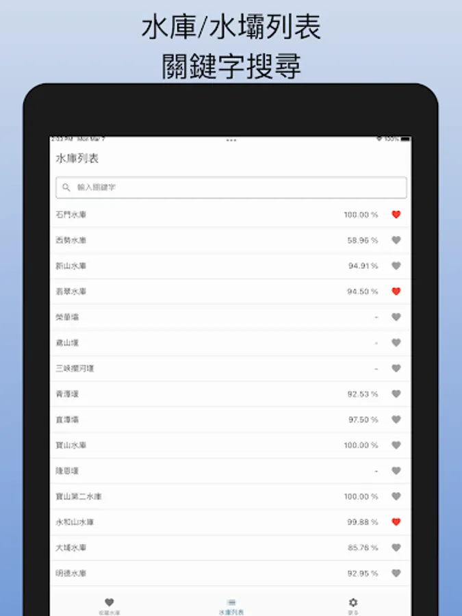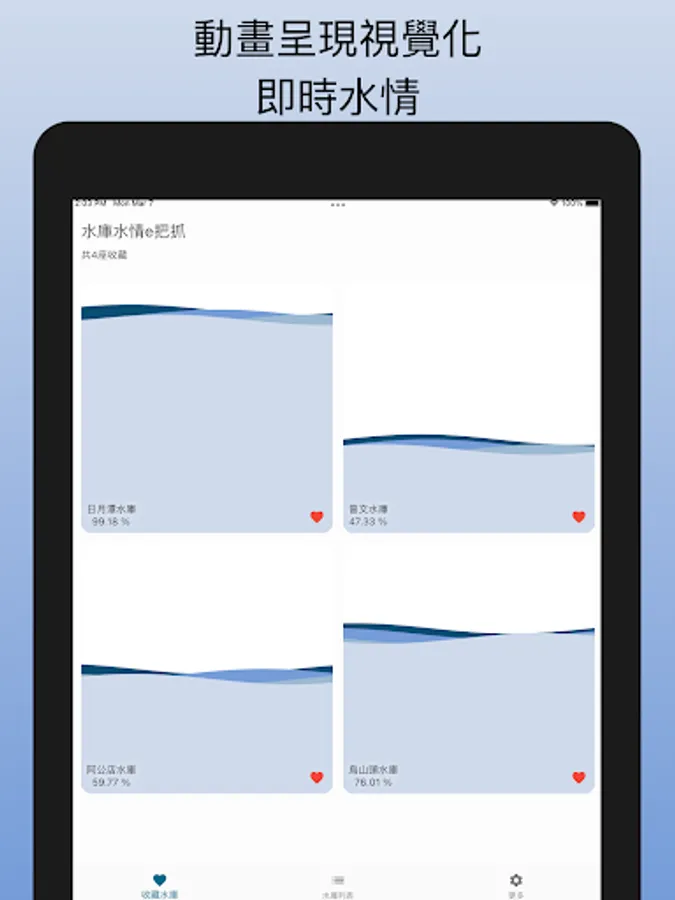 Reservoir water situation e-grasp is to use the Open Data provided by the Water Conservancy Administration of the Ministry of Economic Affairs to present the real-time reservoir/dam water situation in Taiwan. It presents the real-time water storage volume and reservoir status visually in an animation way, and adds a keyword quick search function. It can search for the reservoir facilities you care about, so that you can quickly grasp the real-time reservoir water conditions.
