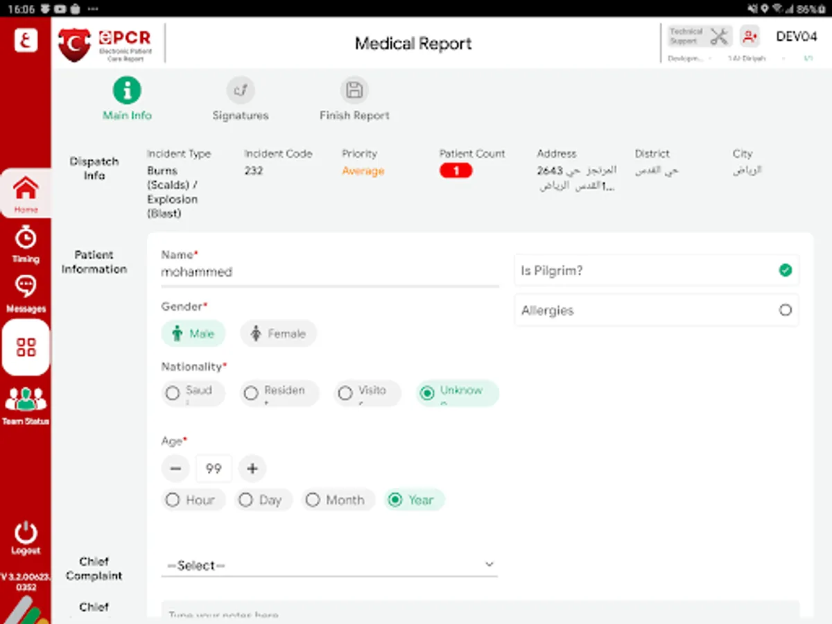 Electronic patient care report application designed for Saudi red crescent authority to automate the operation of storing patient medical report information such as:
