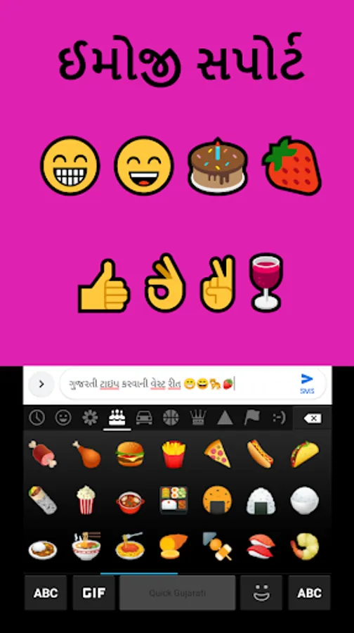 Quick Gujarati Keyboard provides the option to type Emoji icons in your message like on Whatsapp,facebook messenger or texting SMS.