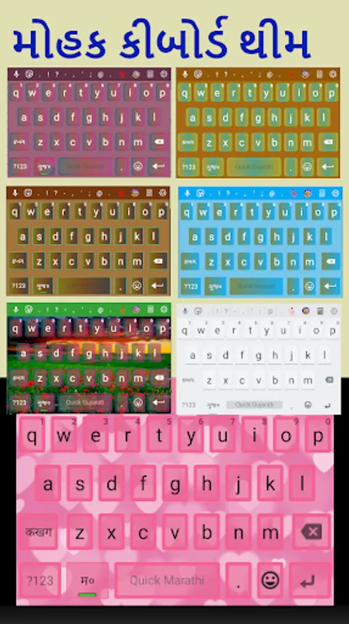 App will help to type your all words in Gujarati. Our app is having more than 300 Emoji and it is fully free to use in any text message format.And yes it is supporting more than 10 languages. Quick "Gujarati keyboard" app will allows you to type message, Story, E-mails,blogs etc. in Gujarati language. You will also find superb eye catching themes on Quick Gujarati Keyboard. You can also customize these themes in keyboard and make it more attractive as per your wish by making required modification in custom settings.