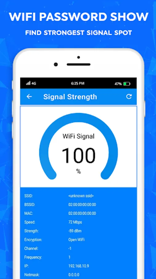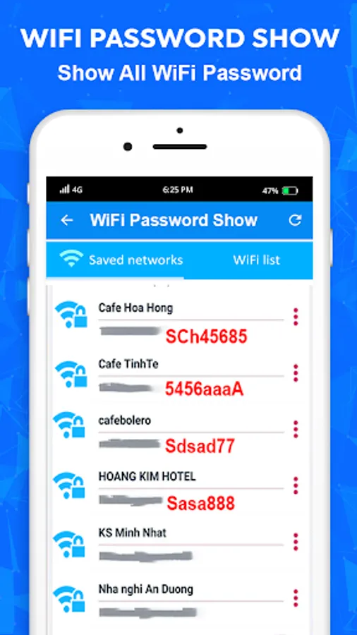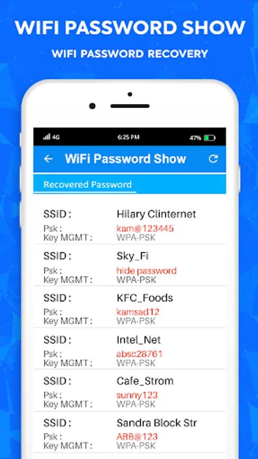 WiFi Password Show Master key is useful for the purpose of restoring wifi password and display all wifi passwords. Wi-Fi password Show app also show details about Wi-Fi Access points, channels, frequency, SSID and IP address.