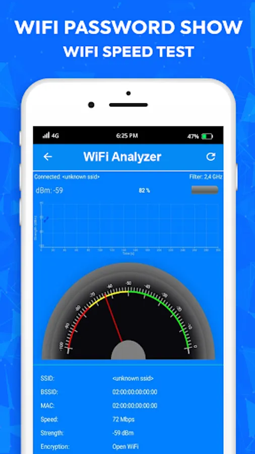 Wifi Analyzer is very useful to analyze and optimize wifi networks. Check wifi signal strength and find the best signal place. This Wifi network analyzer helps to decrease interference and increase connection speed and stability. Graph Access Point signal strength over time. WiFi band, IP Signal strength and Network SSID. WiFi Speed Analyzer can measure exact internet speed on one tap.