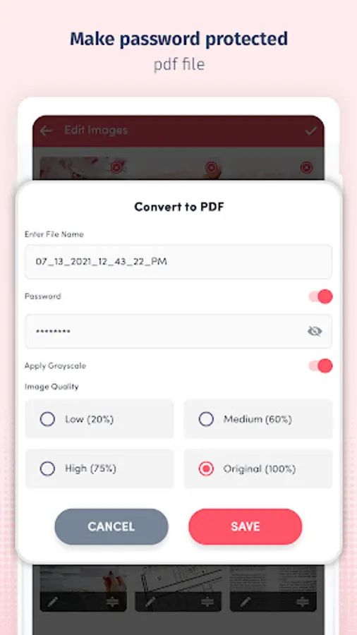 - JPG to PDF converter supports the generation of password-protected PDF.