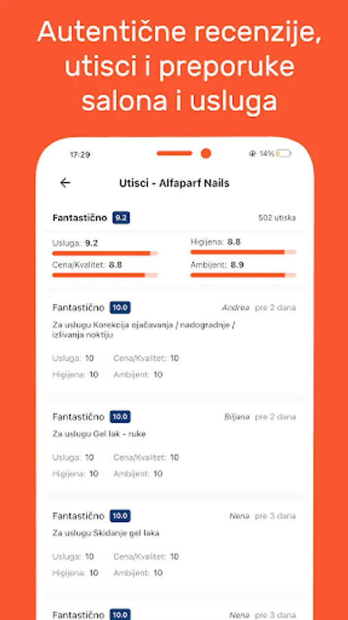 Find the best salons and new services in beauty salons, check the dates and times when they have free dates and choose the one that suits you best. You can compare prices, duration of treatment, impressions and ratings given by other users of SrediMe service. All salons are presented with photos, so you can take a peek at each salon before making an appointment.