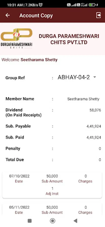 customers can login and view their account copy,outstanding details with few clicks .To get your user name and password,please contact Durga Parameshwari chits pvt ltd.