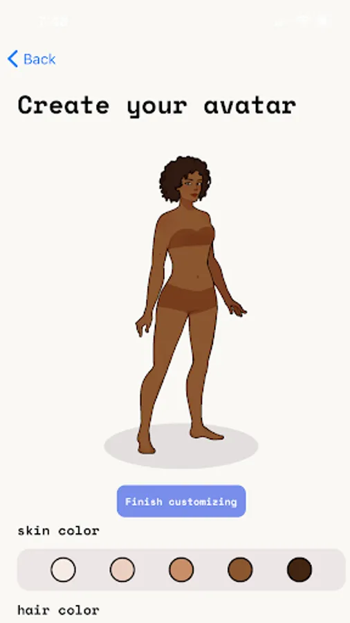 1. When you create an account, you first need to create your avatar. You can choose from 6 different body types, 5 skin colors, and a number of hair options.