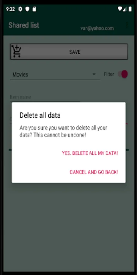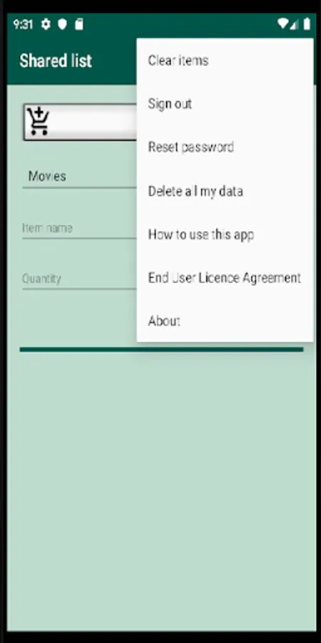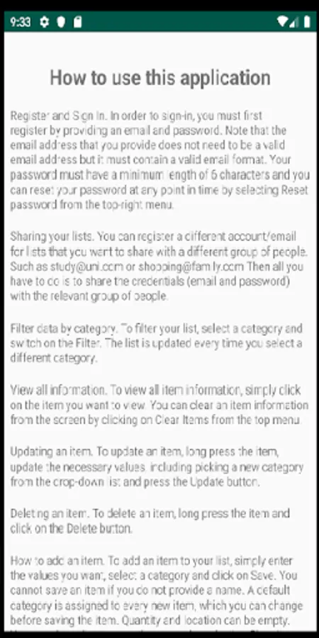 You cannot save an item if you do not provide a name. A default category is assigned to every new item, which you can change before saving the item. Quantity and location can be empty. You can clear all values on the screen by selecting Clear Items from the top-right menu.