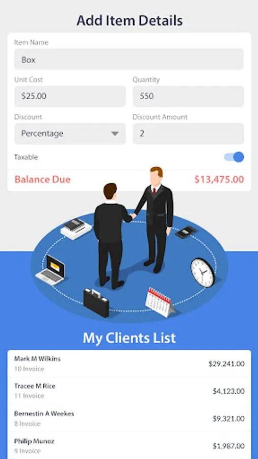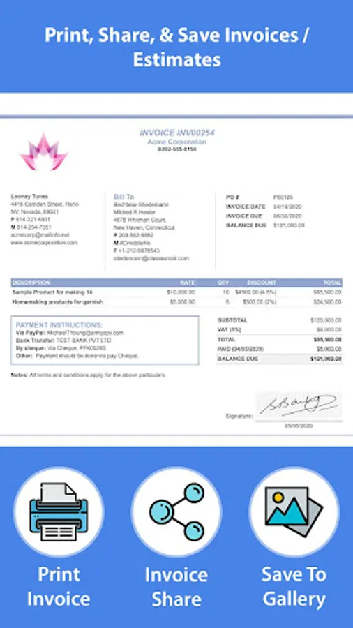 The app generates professional invoice and estimate easily. It automatically calculates taxes, discounts, total amount and payable amount. You can also sign your invoices and estimates. You can also save additional notes, images and payment details in your invoice/estimate. App allows you to save, share, and print your invoices and estimates.
