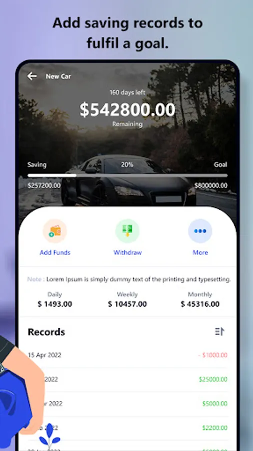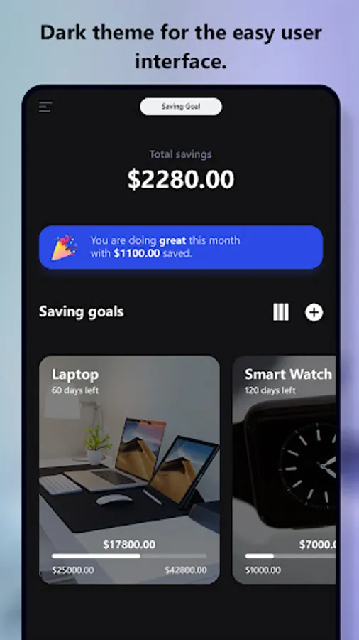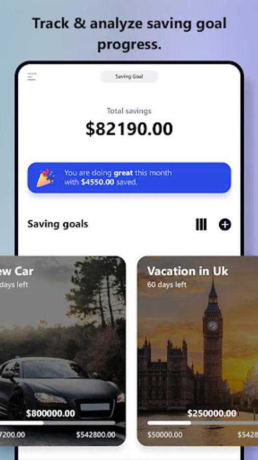 Visualize your savings goal, make it meaningful, and manage your budget and expense. Use this powerful Savings Goal: Piggy Bank app to set your savings goal, build habits in saving money, and track the progress of your goals.