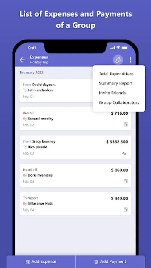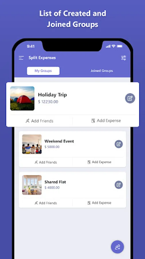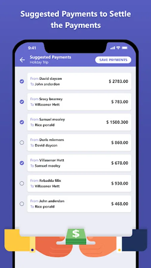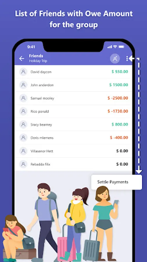 ➟ The app shows all the friends of the group with owe amount for the group expenses. You can also view the expenses, payments, and benefits of each friend. You can also view suggested payments to settle up the expenses of the group.