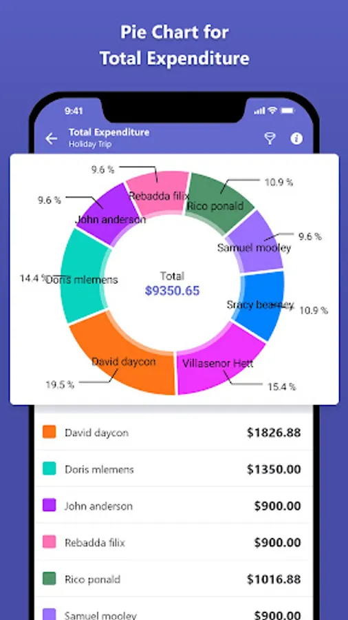 ➟ The app allows to view total expenditure pie-chart for the group. It helps you to glimpse the expense share of each friend in the group.