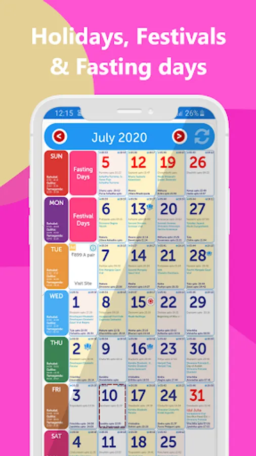- The calendar provides all details of daily events, fasting days, and Indian festivals.