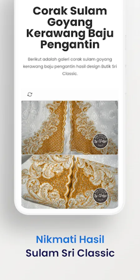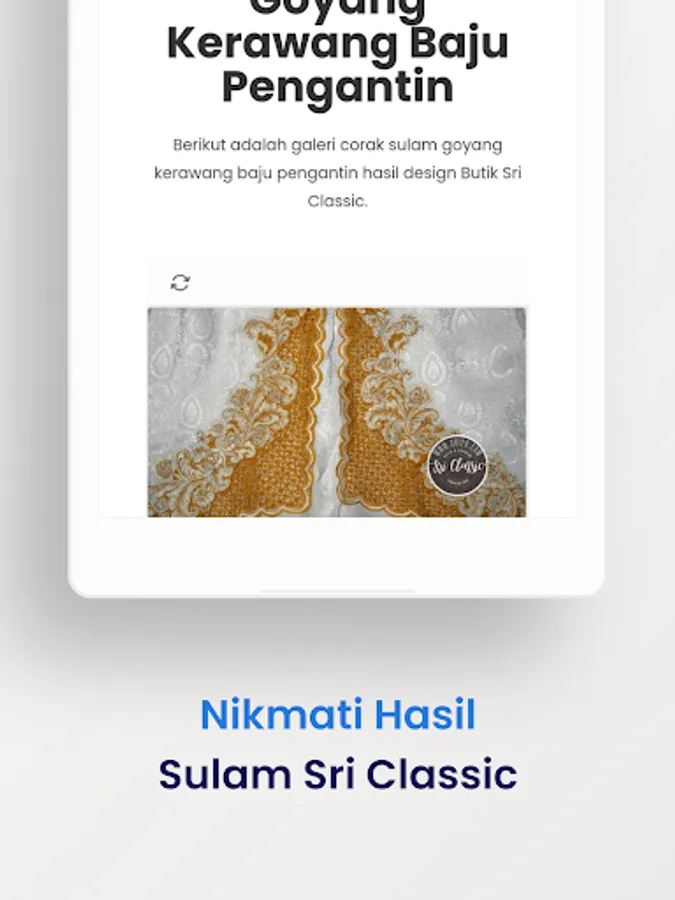 Let's witness the beauty of traditional embroidery art with the amazing collection of Sulam Goyang Kerawang from Sri Classic Boutique! Our application presents a unique combination of cultural heritage and modern technology, allowing you to enjoy the amazing beauty of filigree embroidery easily and comfortably.