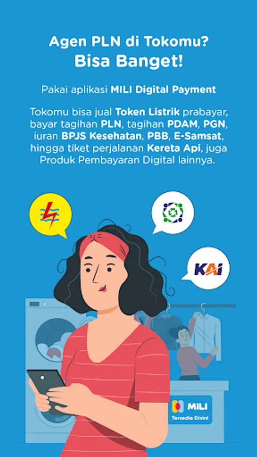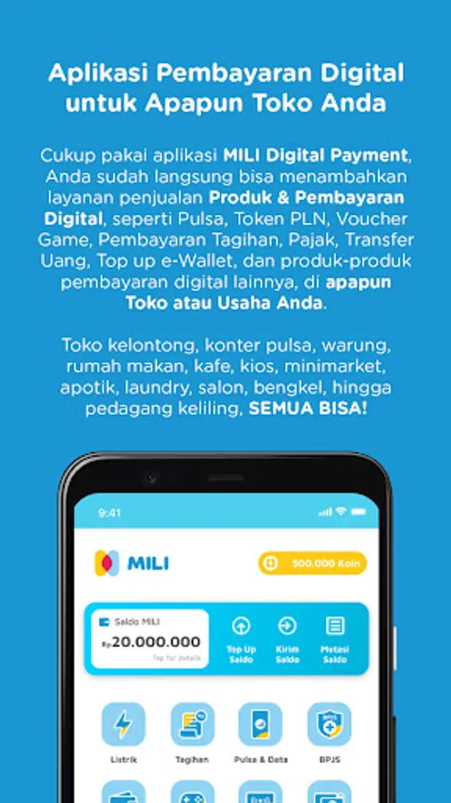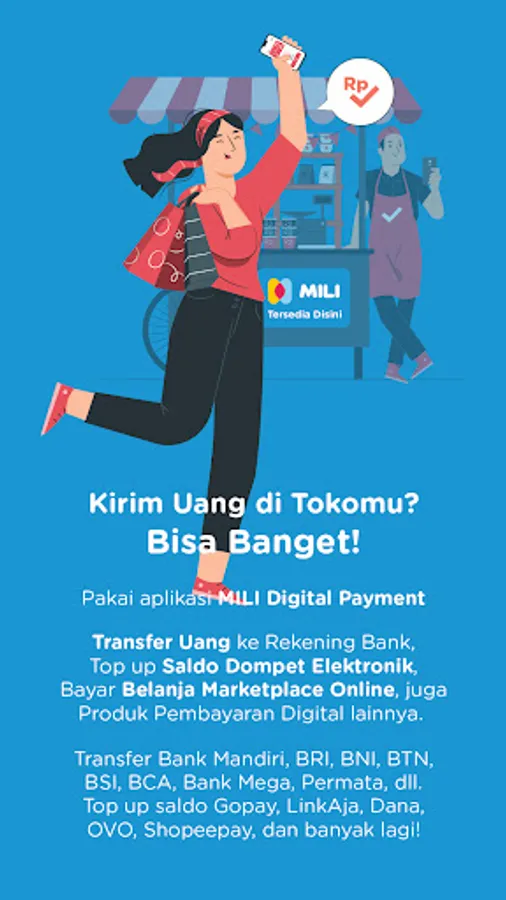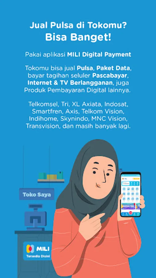 MILI Digital Payment adalah aplikasi yang mendukung para pengusaha sektor ritel, seperti toko kelontong, konter pulsa, warung, rumah makan, kafe, minimarket, apotik, laundry, salon, bengkel, agen-agen perorangan, hingga pedagang keliling, untuk menyediakan berbagai layanan transaksi produk digital dan pembayaran online, seperti: