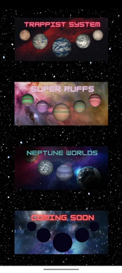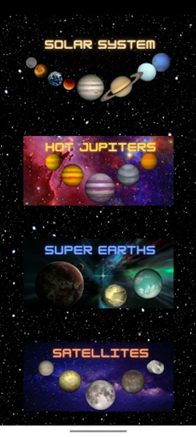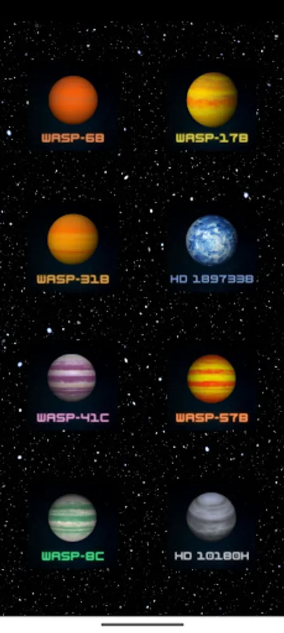 There are different categories in Exoplanets such as Hot Jupiters, Super Earths, Trappist System, Super Puffs, Neptune Worlds, Super Gravity, etc. Hot Jupiters included in this app are Wasp-6b, Wasp-8c, Wasp-17b, Wasp-31b, Wasp-41c, Wasp-57b, HD 10180h, HD 189733b, GJ 1148 b and BD-1763 b.