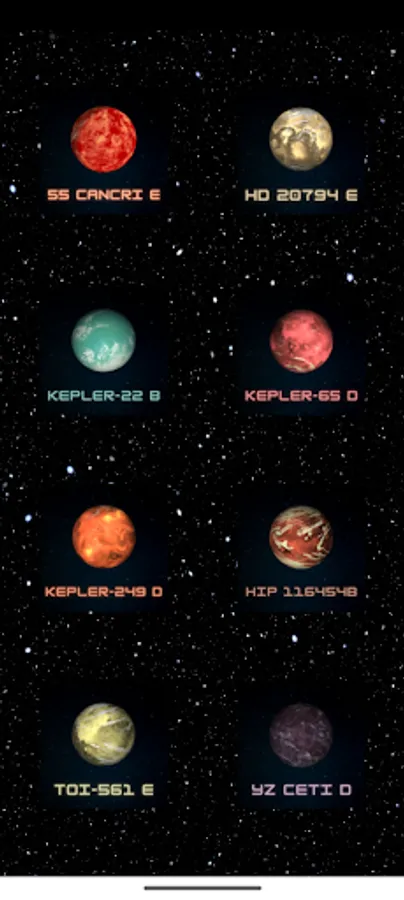 Super Earths included in this app are 55 Cancri e, HD 20794 e, Kepler-22b, Kepler-65d, Kepler-249d, HIP 116454b, TOI-561e, YZ Ceti d, CoRoT-7 b and Kepler-452b.