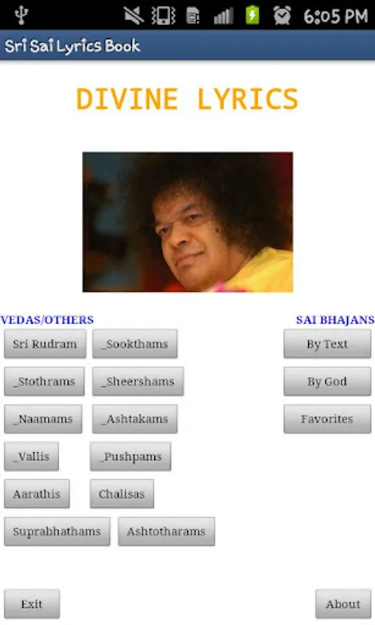 An application developed for lyrics of Hindu Vedas and Sai Bhajans. Most of the holy lyrics can be found and read as plain English text in the application. There are multi-lingual PDFs in various Indian languages for certain scriptures.