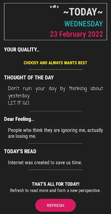 Since a lot goes on in our minds during a certain situation, the app just makes an attempt to remind you some thoughts or facts which might help you resolve our mindset and bring your mind to rest and calm.