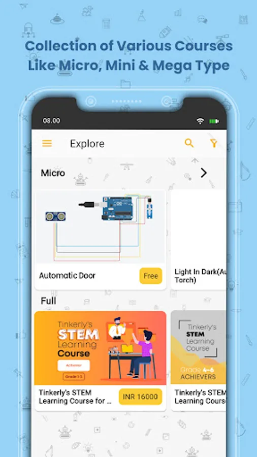 The Explore section of the Let's Tinker App consists of customizable free short courses on coding for kids that are divided into 3 categories- Micro, Mini, & Full Courses.