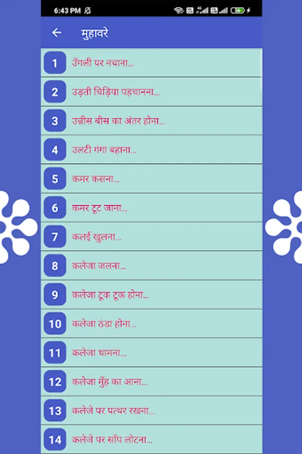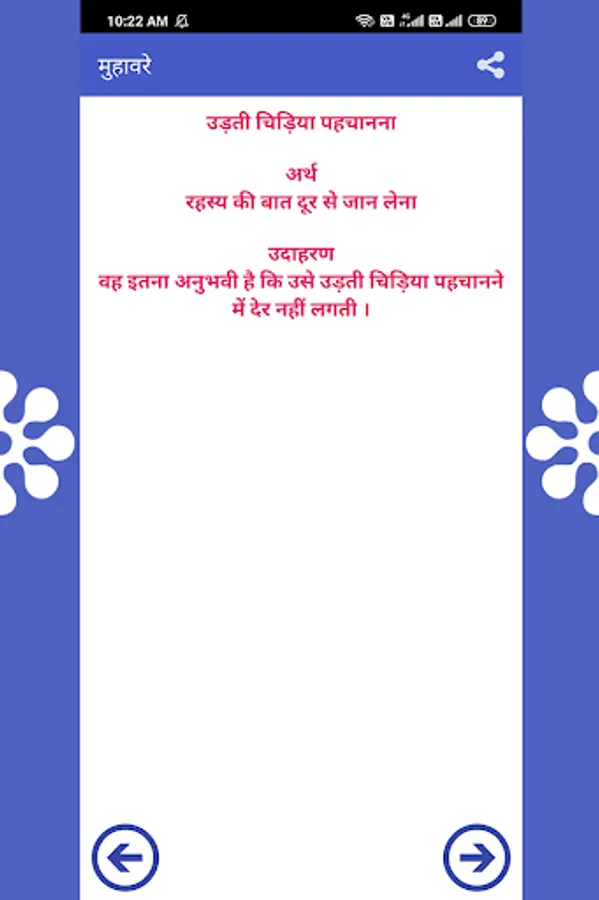 Hindi idioms ( हिंदी मुहावरे ) or hindi muhavare aur Lokoktiyan (लोकोक्तियाँ) is a very useful application to learn idioms in hindi language. muhavare in hindi (हिंदी में मुहवारे) is a very important part of hindi language. Every language or every culture has specific idioms and phrases. idioms are usually a clever expression that indicate the advice and obvious truth. or idioms are used to explain a condition independently in a few words.