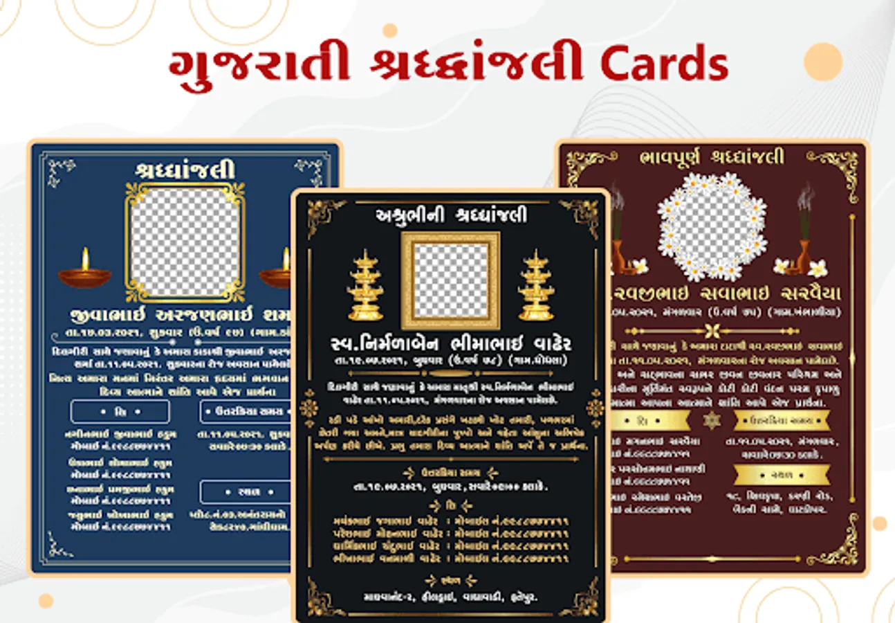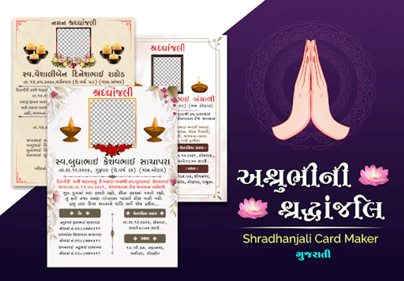 In this digital world, using a smartphone, create श्रद्धांजलि Card without visiting any photo studio. This Shradhanjali Digital Card Maker is also known as e-card maker app for condolence, tribute, demise, Besnu (બેસણુ), शोकसभा, Bhavpurna Shradhanjali Banner (भावपूर्ण श्रद्धांजली बॅनर), भावपूर्ण श्रद्धांजलि फोटो फ्रेम, Shok Sandesh Card Maker (शोक संदेश कार्ड मेकर), Death Photo Frame, Punyatithi Photo Frame, Death Anniversary Photo Frame, RIP Photo Frame, Get-together for the memorial service.