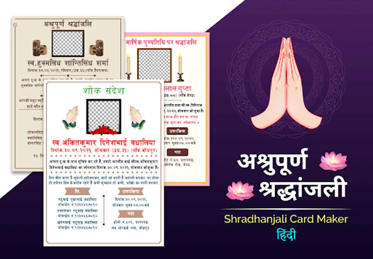શ્રદ્ધાંજલિ Card Maker helps to create condolence cards on the demise of a person fast & easy along with शोकसभा, श्रद्धांजली बॅनर, श्रद्धांजलि फोटो फ्रेम, शोक संदेश कार्ड.
