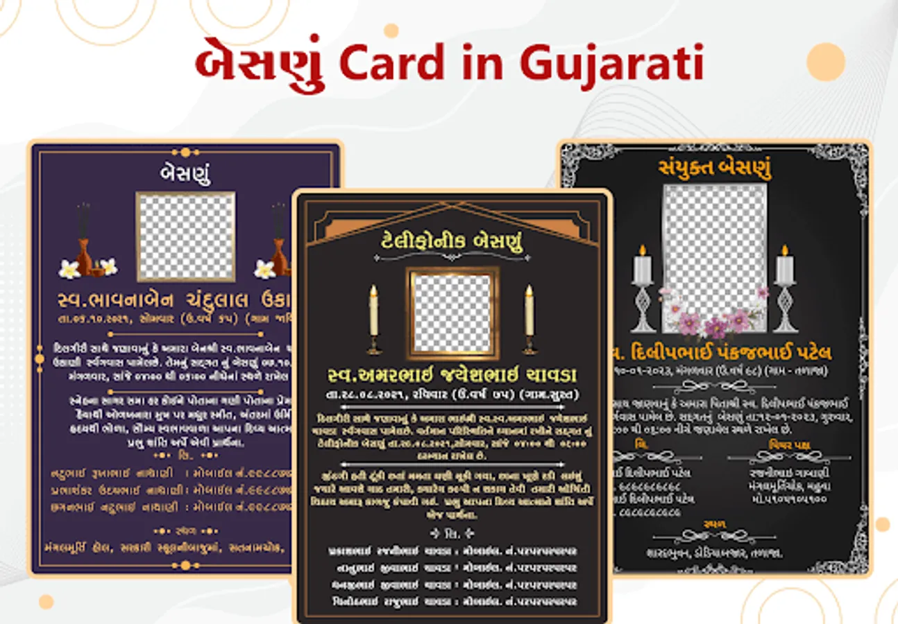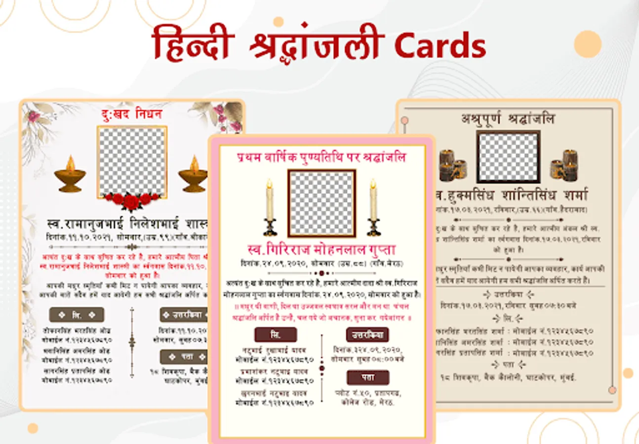 Create Funeral Digital Card within a few seconds and steps. App gives a huge collection of Shradhanjali, Besnu, Shoksabha, Panidhol, and many more cards.