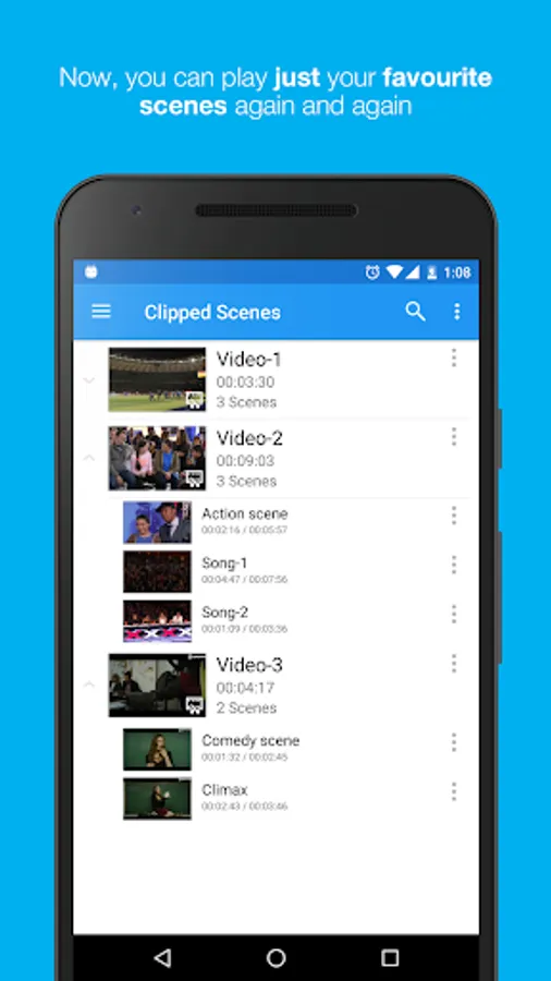 Split your videos into sub-clips to watch only specific scenes you like the most (action, comedy, romantic, songs etc.) without playing the full video.