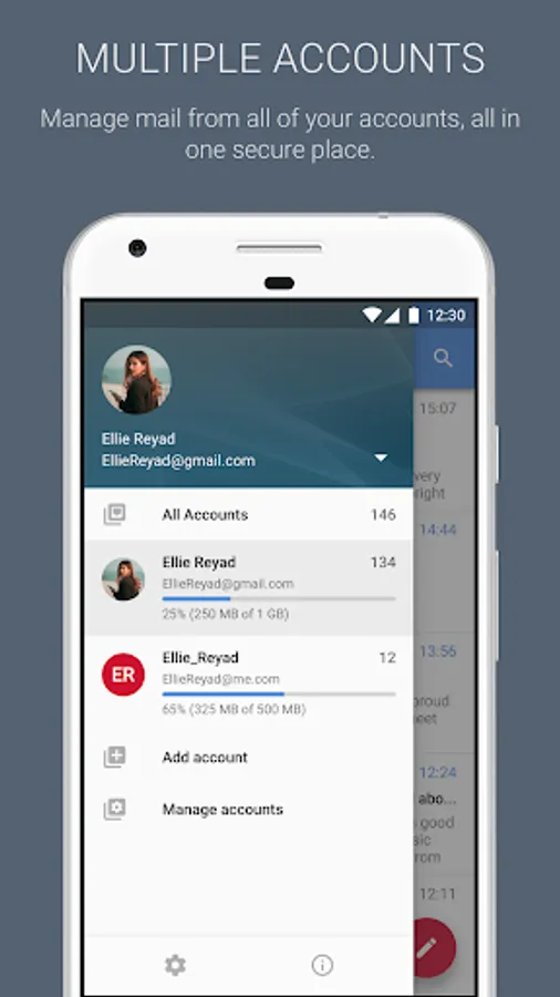 All Accounts in One – Manage emails from Gmail, Google Apps, Outlook, Office 360, Yahoo! Mail, AOL, iCloud or any other IMAP server.